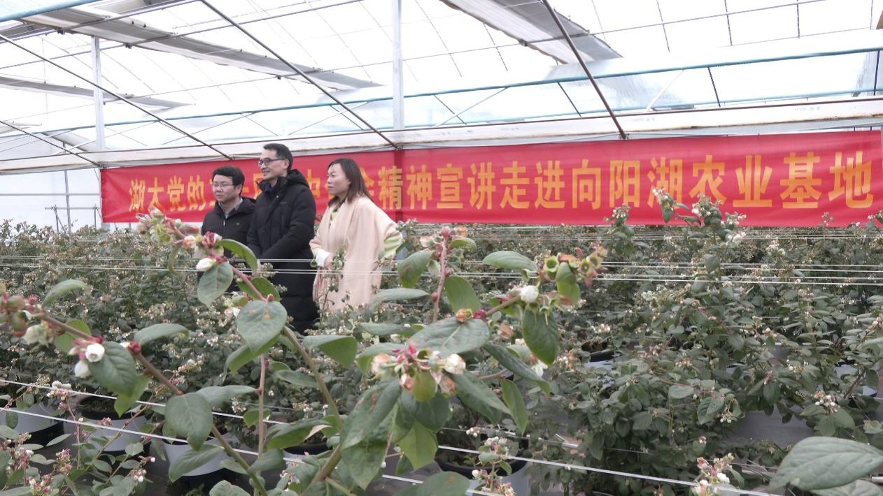 在向阳湖农业科技产业园蓝莓种植基地,公司党委书记李中伟与园区工作人员、种植户亲切交流,共话农业产业发展新思路,探讨党建引领与产业振兴融合新路径。与此同时,胡艳华教授以“加快农业农村现代化,推进乡村全面振兴”为主题,在大棚基地开展联袂宣讲,她结合当地农业特色,生动解读全会关于乡村振兴的战略部署。宣讲结束后,胡艳华教授协同公司硕士生导师燕红亮和研究生熊智勇围绕“一二三产业融合助力乡村全面振兴”主题开展实地调研,与农户、企业代表座谈,深入了解产业现状与发展需求,为课题研究积累实证资料,为理论联系实际积累鲜活素材。下午,胡艳华教授、燕红亮老师和熊志勇继续深入广东畈村开展座谈调研。