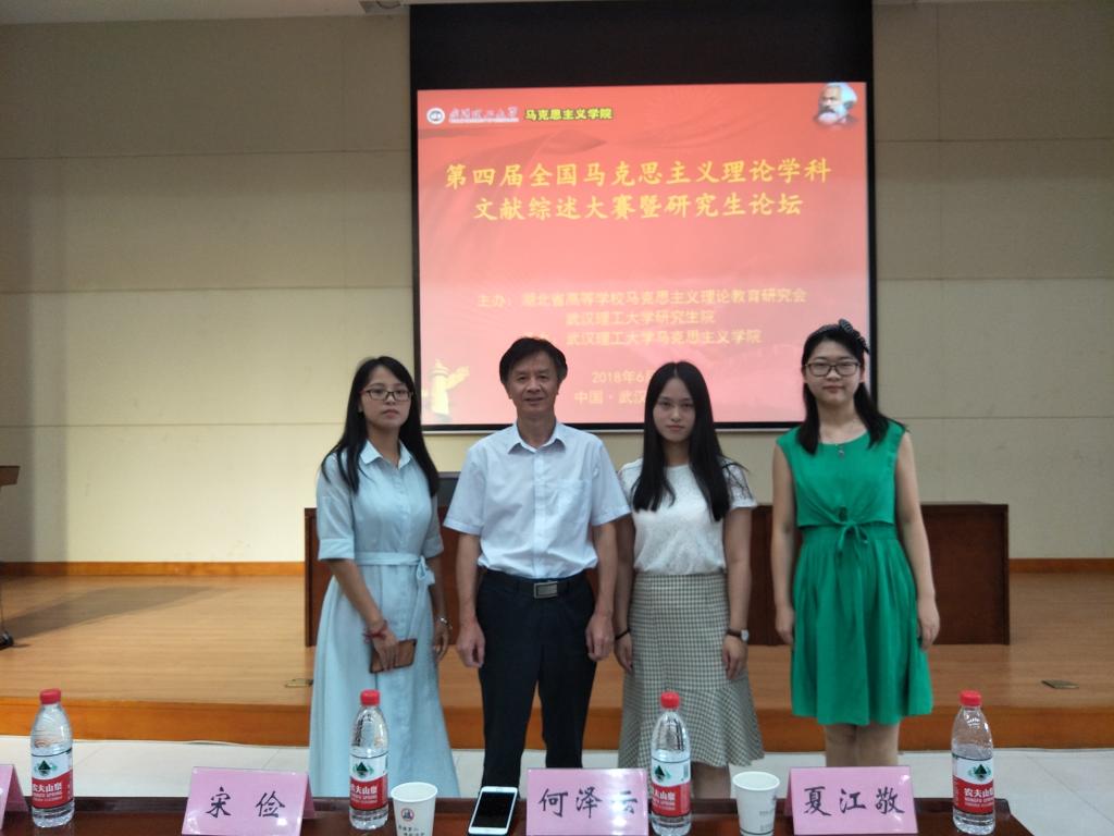 6月23日,由湖北省高等公司马克思主义理论教育研究会、武汉理工大学研究生院主办,武汉理工大学永利yl23411承办的第四届全国马克思主义理论学科文献综述大赛暨研究生论坛在武汉理工大学(马房山校区)顺利召开。武汉理工大学党委副书记夏江敬、湖北省教育厅思政社科处何泽云处长、湖北省高等公司马克思主义理论教育研究会秘书长李资源教授、武汉大学永利yl23411宋俭教授、华中师范大学永利yl23411经理万美容教授、华中科技大学永利yl23411副经理黄长义教授、公司经理徐方平教授等领导和专家应邀出席。来自清华大学、复旦大学、南京大学、厦门大学、四川大学、南昌大学等30多所高校的近100名硕士研究生和博士研究生参加。公司2017级马克思主义基本原理专业博士研究生沈钰晶,2016级思想政治教育专业硕士研究生赵璐、禹荟彩以文入会。
